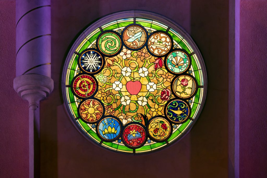 The center focal point is breathe taking and beautifully designed stain glass window with the representation of the Disney princesses (many would come to think of it from the popular video game Kingdom Hearts) as the resort invited guests, cast members, community partners and Disney friends, including Mickey Mouse, to share their own dreams and wishes on “magical dream cards.” These cards were collected in a treasure chest, and lifted to the top of the tallest tower in the castle ensuring that the heart of the resort will always be filled with hopes and dreams.