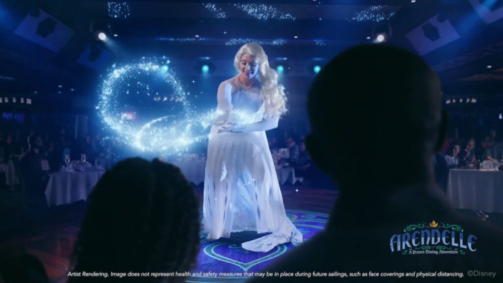 Designed in the style of a theater-in-the-round, this purpose-built entertainment venue will feature dining tables situated around a small center stage and all the theatrical bells and whistles needed to bring a story to life in 360-degree glory. Invisible fiber optics embedded in the ceiling will conjure Elsa’s icy magic, and panoramic windows will magically transform from real-time ocean views to the colorful dancing lights of the Aurora Borealis.