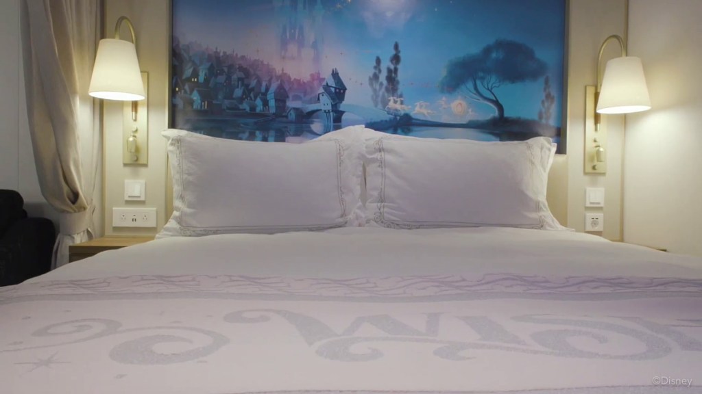 Imagineering has come up for every stateroom to be a mellow and dreamy worlds based off Disney fairytales with gold-leaf details and headboard murals that were exclusively commissioned for the Disney Wish. The staterooms will be a blend of classic and contemporary Disney stories in essence with the ship’s theme based off Cinderella (or “a dream is a wish your heart makes when you’re fast asleep”).