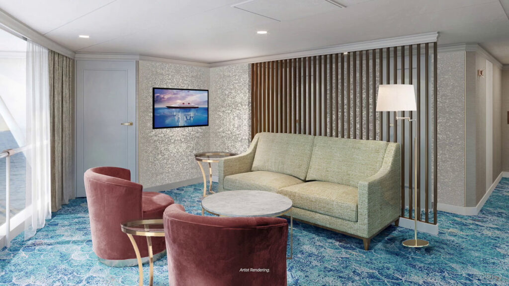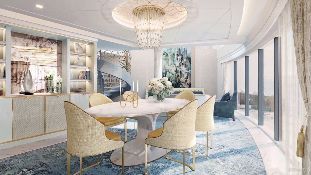 Four royal suites will be on the Disney Wish from details from the animated classic film Disney’s “Sleeping Beauty” that will be two Aurora Royal Suites and two Briar Rose Royal Suites. Each suite will have a single-floor option and a two-story option for the first ever done on a Disney ship.
