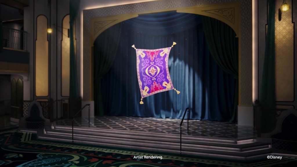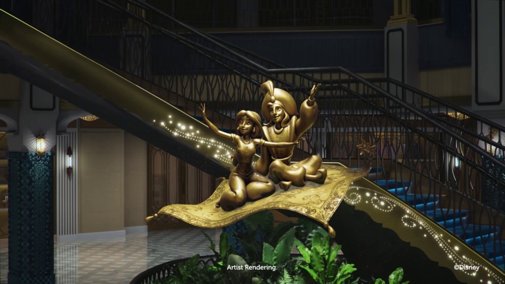 The Grand Hall is inspired by the grandeur and mystery of a gilded palace, drawing on real-world influences from Asia and Africa, and paying homage to the far-off land of Agrabah. At the center, the signature statue will feature Aladdin, Jasmine and their Magic Carpet.